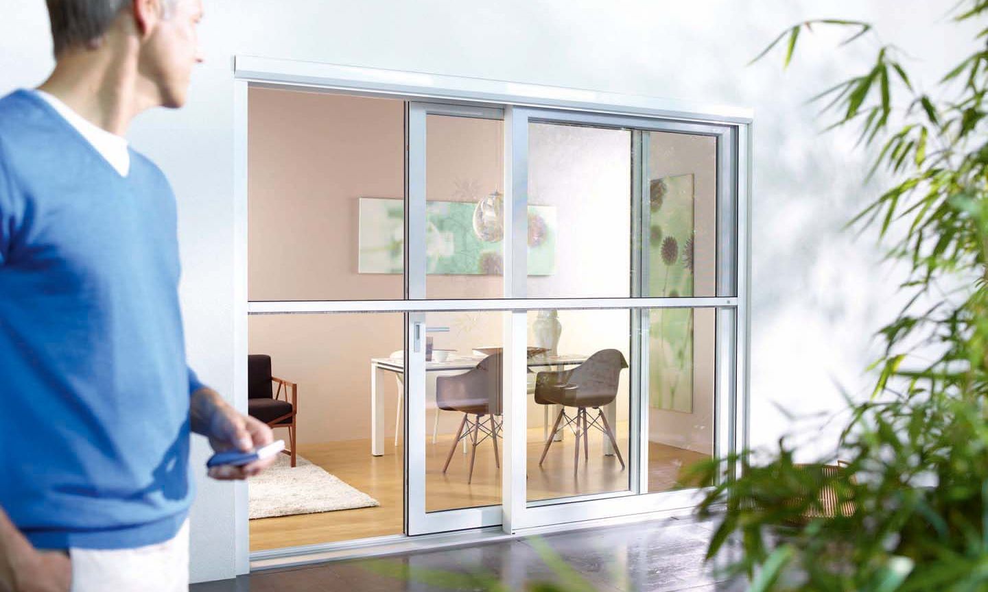 Die Schiebeanlagen werden vorrangig bei großen Öffnungen verwendet, wo einflügelige, aber auch komplexe Anlagen zum Einsatz kommen. Die farblich abgestimmten Muschelgriffe sind in die Doppelkammerprofile der Schiebeanlage eingepasst. Die Stabilität bleibt durch spezielle Verbindungen in vollem Umfang erhalten und ermöglicht dadurch große zusammenhängende Gewebeflächen.