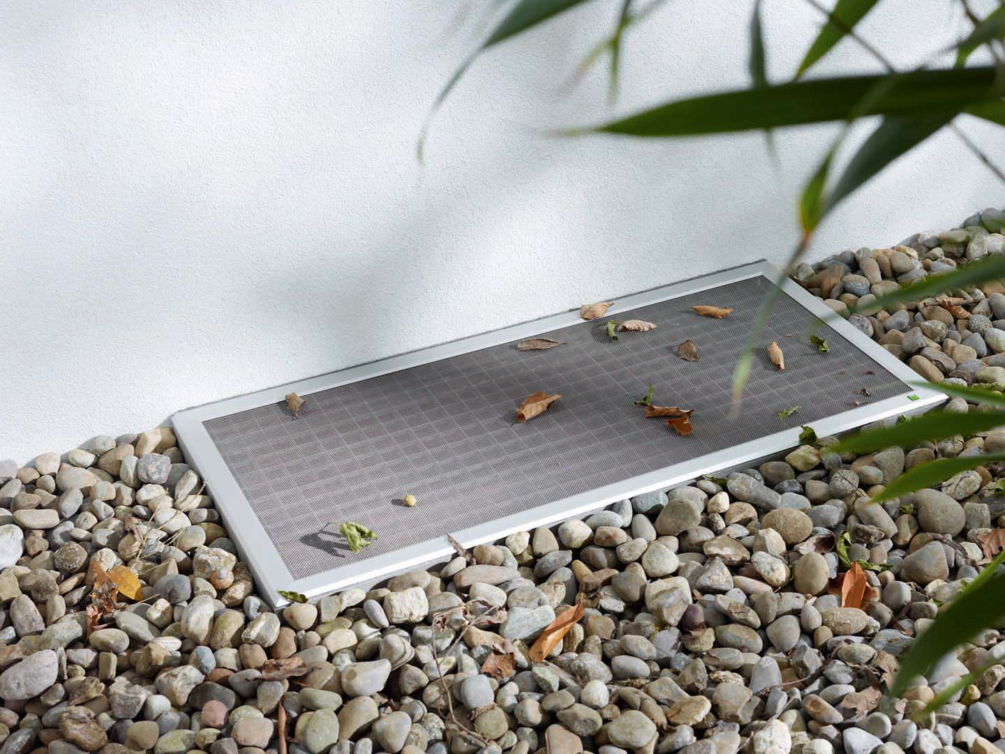 Elegante, silbergrau eloxierte Aluminiumprofile und ein hochwertiges Edelstahlgewebe verblenden in optisch ansprechender Weise jeden Lichtschacht, auf Wunsch auch als regensichere Ausführung aus hochtransparentem, trittsicherem und rutschfestem Polycarbonat. Das Belüftungselement mit vorgeschriebenem Strömungsquerschnitt ist durch sein auswechselbares Edelstahlgewebe leicht zu reinigen.