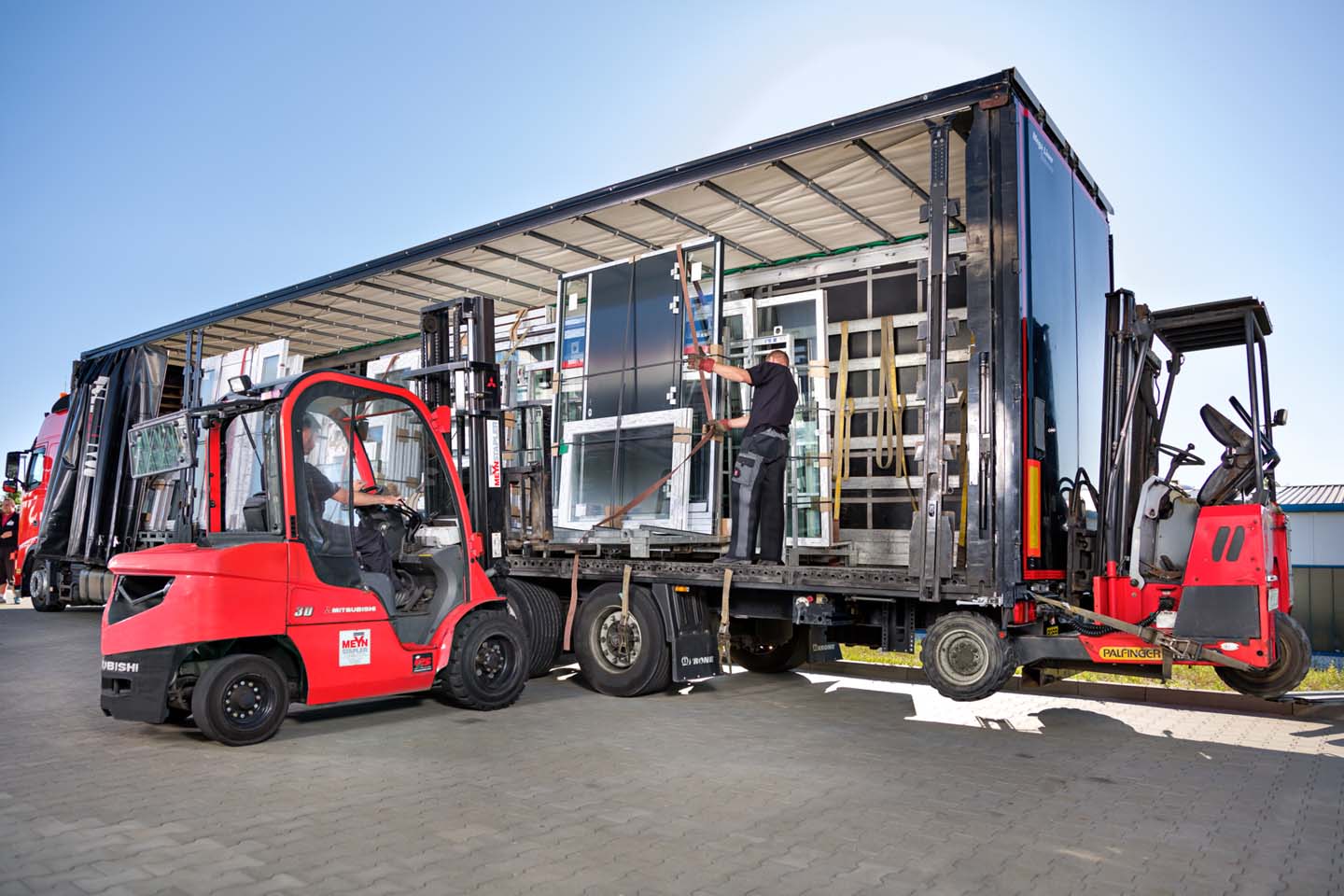 Die LKW-Fahrer haben geländegängige Stapler an Bord, so dass sie vor Ort die Paletten bewegen und abstellen können.