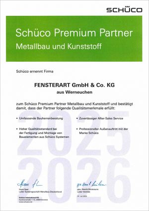 Wir sind stolz, dass FENSTERART erneut mit dem Premium Partner Siegel von Schüco ausgezeichnet wurde.